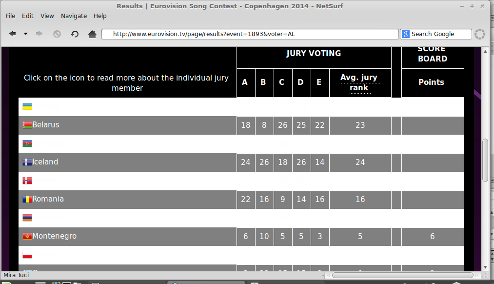 | Steps To Reproduce | The Eurovision results pages (eg. http://www.eurovision.tv/page/results?event=1893&voter=UA) have all the information in boxes above a background image. On other web browsers these boxes are largely transparent, however on NetSurf they are opaque. Without the alpha channel they consist of black or white boxes with white text on top of them. | ||||||||||||