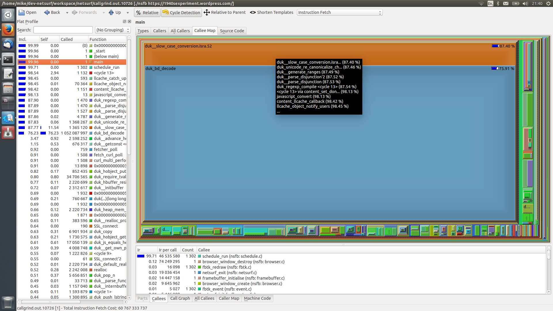 Using the prototype duktape fix, the performance is much better. Most of the time is still spent processing javascript, but its not dominated by regex work. I've attached another profile image which shows the improvement: duktape-fast-regex.png From the 2 images we can see the total instruction fetch cost is reduced to 12% of what it was (from 60 billion to 7 billion). |