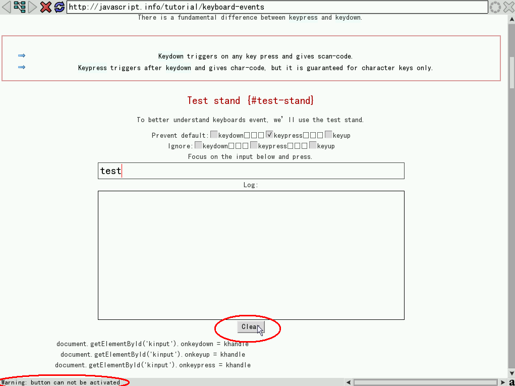 | Steps To Reproduce | Visit http://javascript.info/tutorial/keyboard-events at Test stand {#test-stand},keypress,"Log" not anything out and click on "Clear" button,tips button can not be activated | ||||||||||||