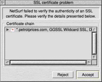 This bug had been mixed up with a similar GTK one This bug is directly related to the RISC OS core window (lack of) support. The RO frontend is using the deprecated treeview compatibility which is broken if multiple SSL certificate issues are found because of (as in this case) a root certificate issue. The bug was updated by Andrew Pinder and recently again by Richard Torrens |