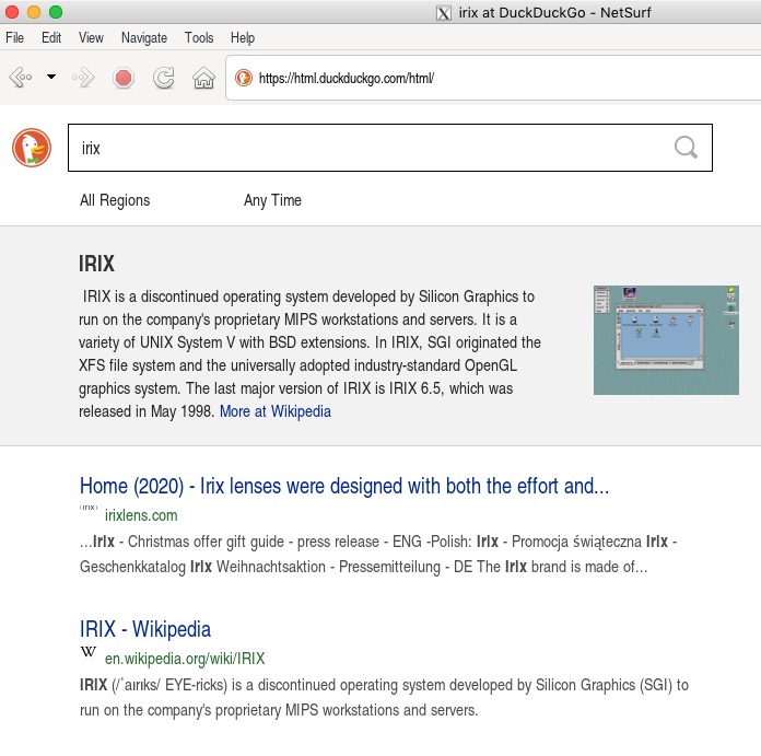 | Additional Information | We're basing the port on the version of Netsurf in FC31, 3.9. Patches and spec can be found here: https://github.com/sgidevnet/sgug-rse/tree/wipnonautomated/packages/netsurf . Netsurf is likely the best chance at having a working modern browser on IRIX. We're unable to attach a debug log, as `netsurf -v` emits whitespace but doesn't launch a window. Without -v, it does launch a window, and sometimes can be stable for whole minutes without crashing. Yes, we're aware IRIX is a dead OS. | ||||||||