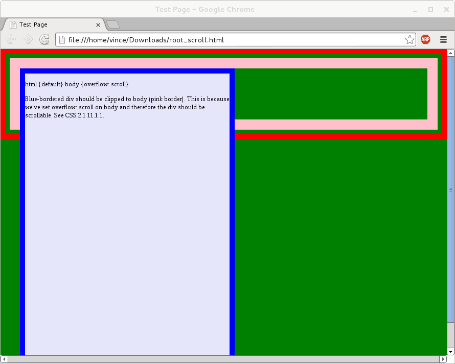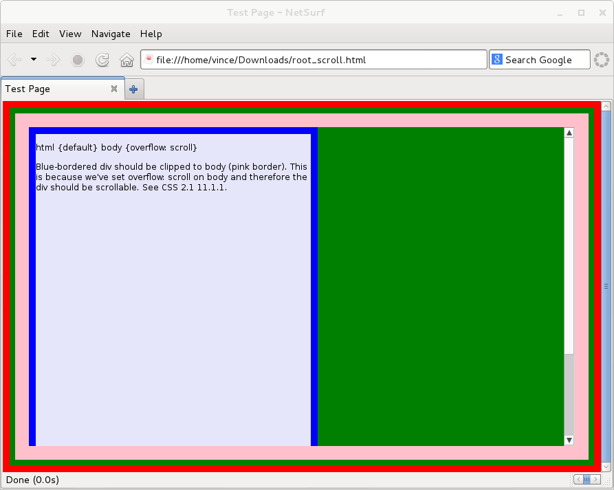 Current master of NetSurf gets the box clipping wrong compared to other browsers (chrome and ff). If the ns window is resized to clip the blue box scrollbars appear, vertical works but horizontal goes badly wrong, starting operation inverted and then corrupting more state. We appear to be corrupting heap somewhere! |